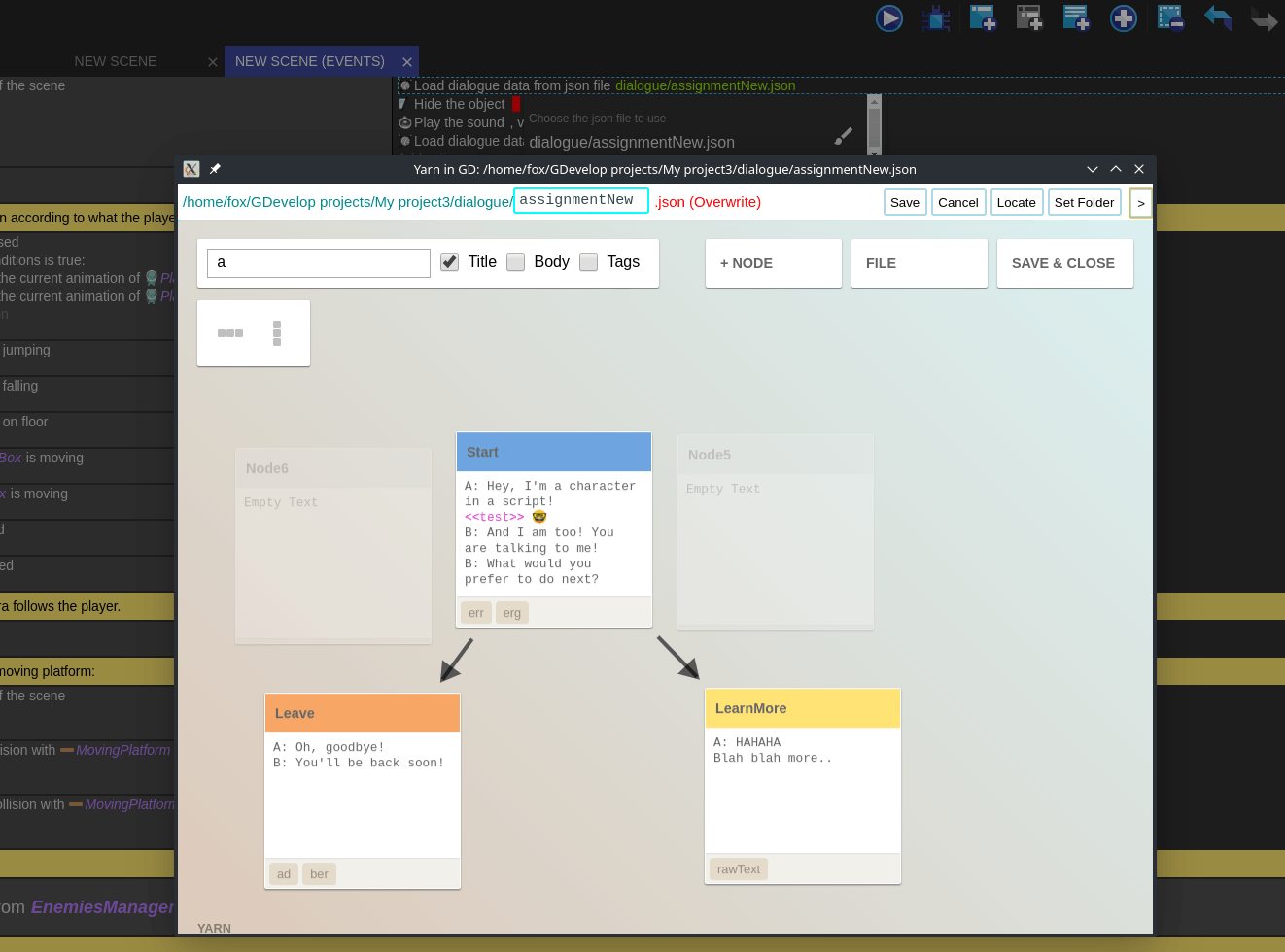 GDevelop bundles a popular story editor called YARN so you can edit your dialogues without leaving GDevelop.