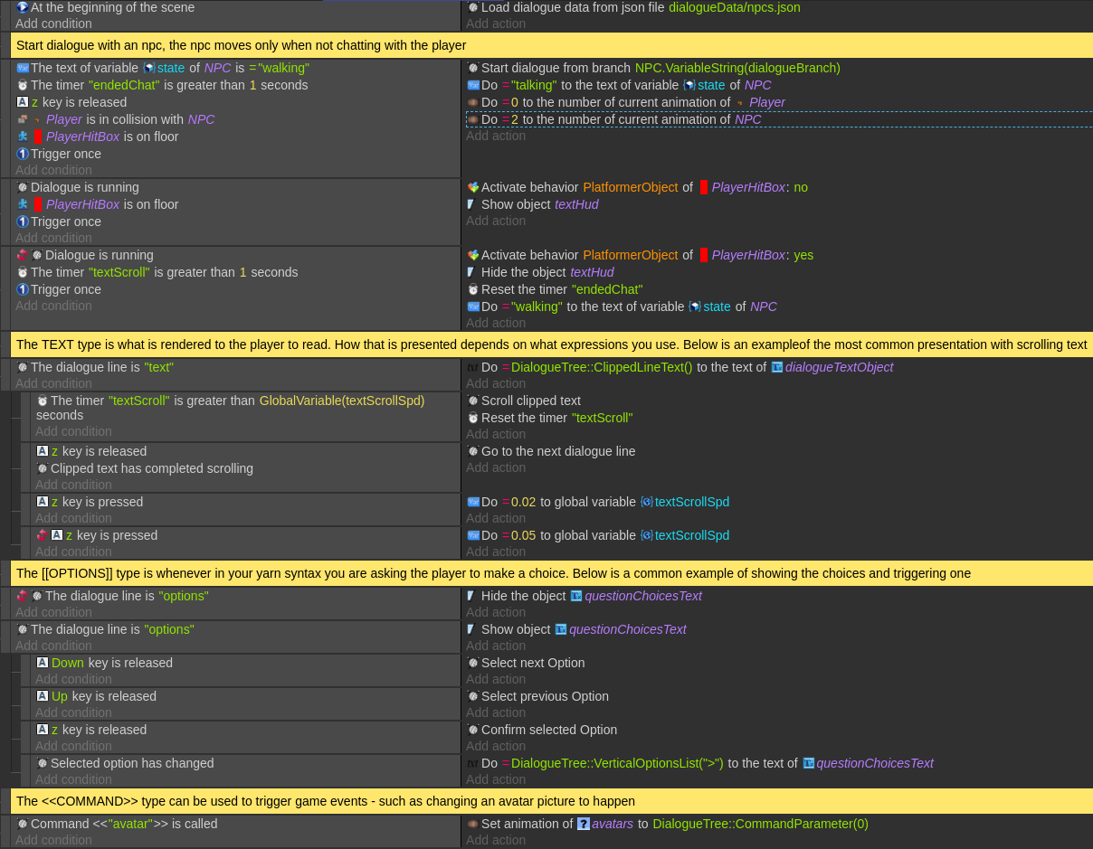 The best starting point is to open the demo project for the dialogue tree extension — the entire dialogue logic fits in about 16 events.
