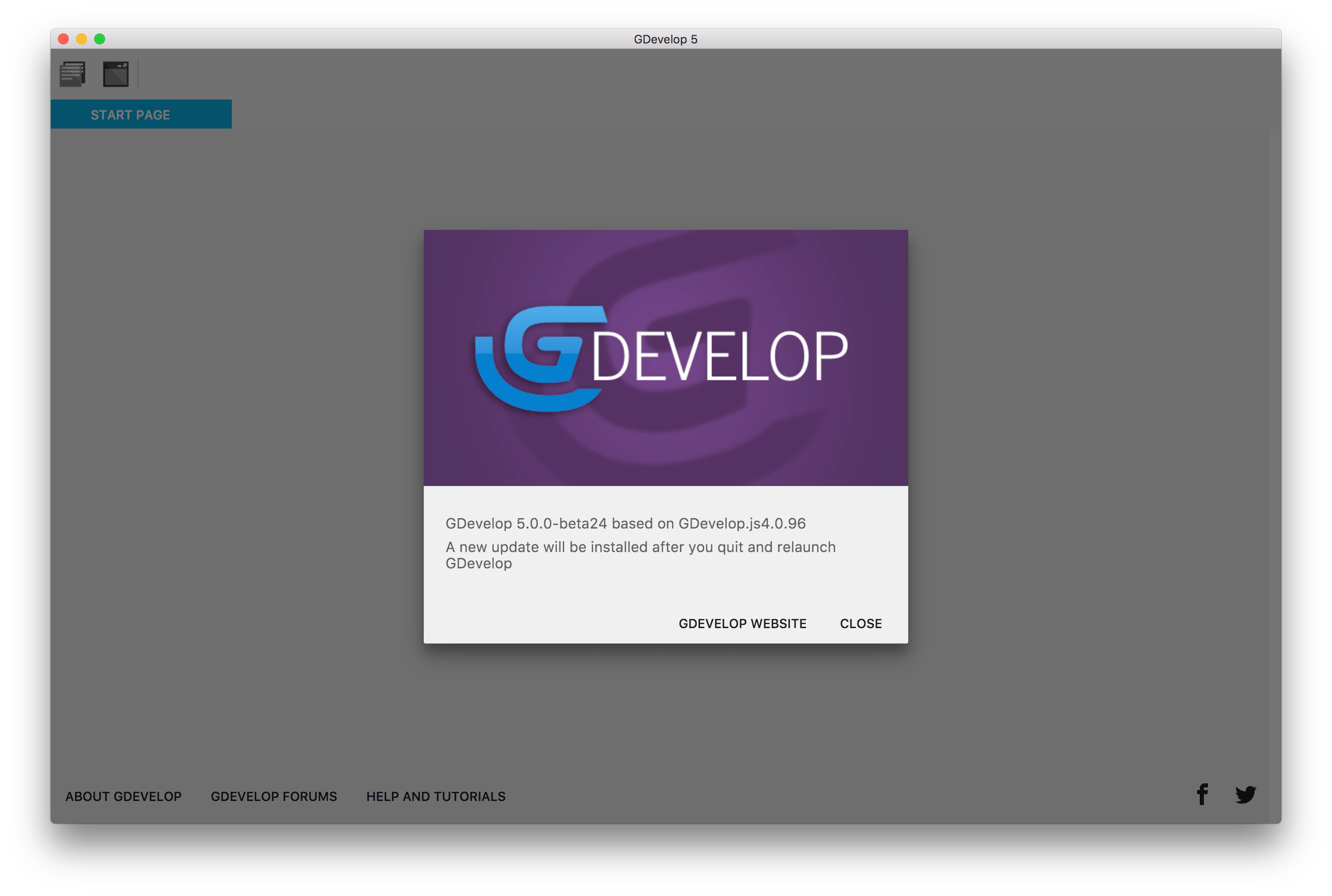You can now close GDevelop and open it again: the new update will be installed. Check again the About window to see the version number updated.