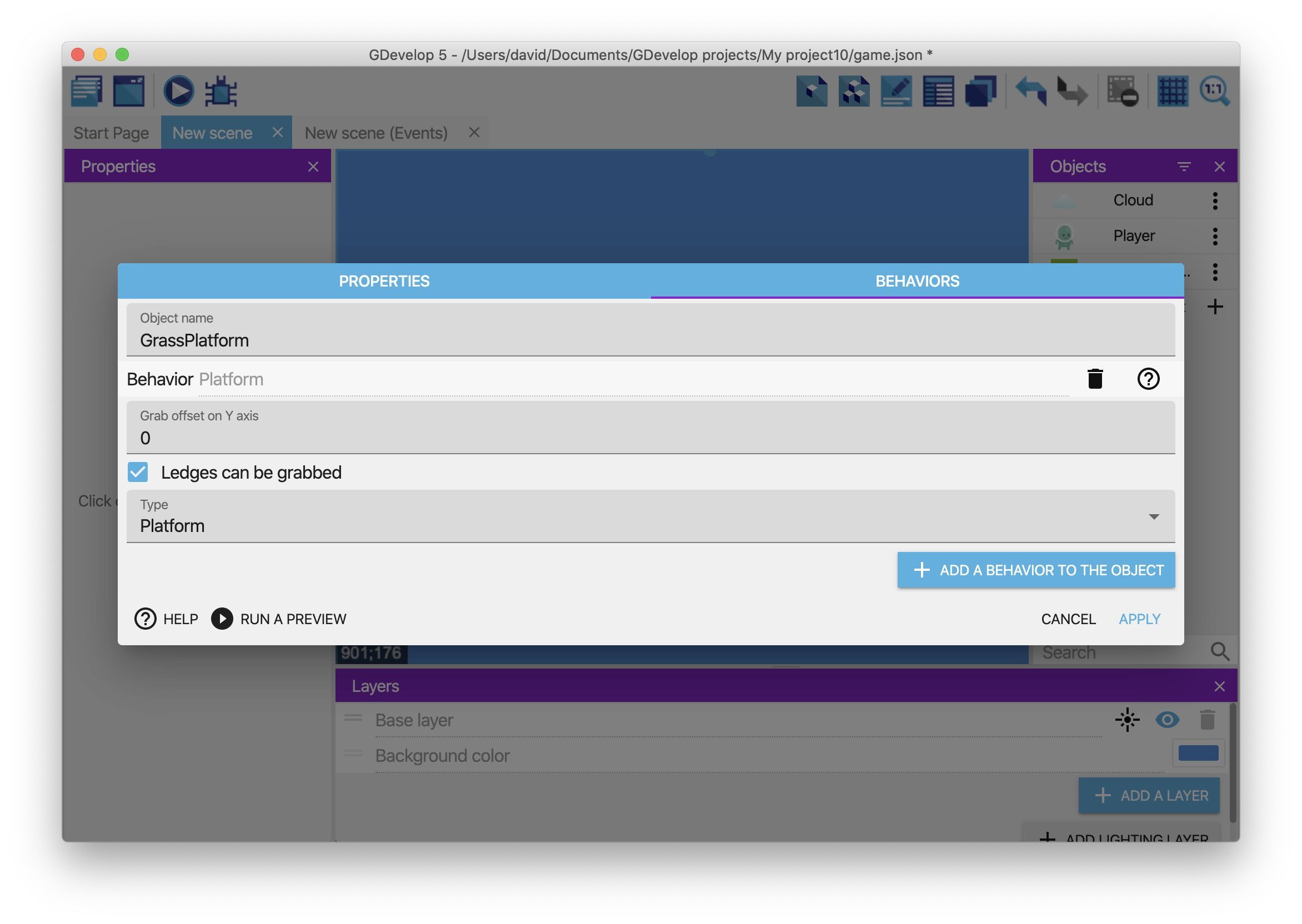 - Open the Behaviors tab for the "GrassPlatform" object.