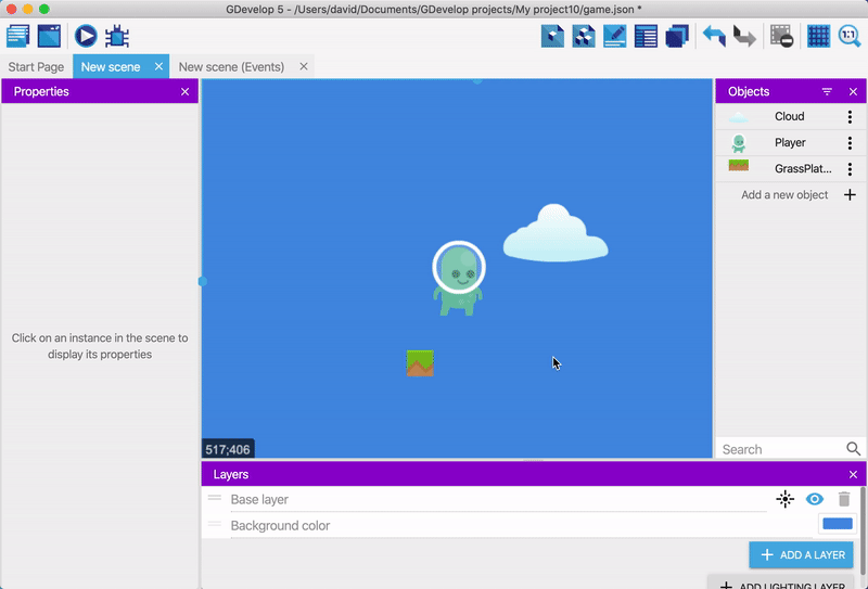 GDevelop also provides the Jumpthru platform behavior. This behavior creates a platform that the player can jump onto from beneath it. This adds more variety to the level.